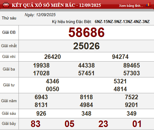 Bảng kết quả số miền Bắc12-09-2025Bảng kết quả số miền Bắc 10-09-2025