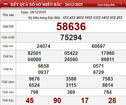 Bảng kết quả lô tô xổ số miền Bắc 26-12-2025