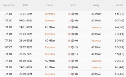 Juventus đã góp mặt trong 8/10 trận gần nhất và trận đấu kết thúc với trên 7 quả phạt góc, đội chủ nhà thường xuyên là đội nhận được nhiều góc hơn, trận nhiều nhất đội chủ nhà đã nhận tới 14 quả góc. Trong khi đó đội khách AC Milan đã góp mặt trong Em 7/10 trận gần nhất và trận đấu kết thúc với trên 7 quả phạt góc, có tới 2 trận đội khách được hưởng 12 quả góc.